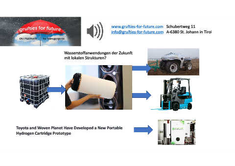 www.grufties-for-future.com Schubertweg 11 info@grufties-for-future.com A-6380 St. Johann in Tirol Wasserstoffanwendungen der Zukunft mit lokalen Strukturen? Toyota and Woven Planet Have Developed a New Portable Hydrogen Cartridge Prototype