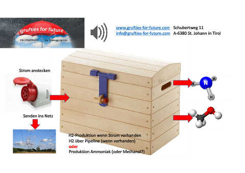 www.grufties-for-future.com Schubertweg 11 info@grufties-for-future.com A-6380 St. Johann in Tirol Strom anstecken Senden ins Netz H2-Produktion wenn Strom vorhanden H2 über Pipeline (wenn vorhanden) oder Produktion Ammoniak (oder Methanol?)